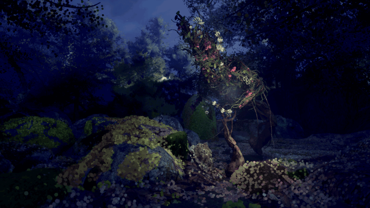 The story is relatively slight, even within the forty-minute runtime. It initially focuses on exploration of the world, before a storm arrives, where it turns into an exhilarating fight for survival. Puck is the only character still standing, not blown away by the fierce winds. The dialogue is composed of lines from A Midsummer Night’s Dream, extracted and stitched together, the result being more of a tone poem than a consistent narrative; instead the slight story is contained in the movement through the world.