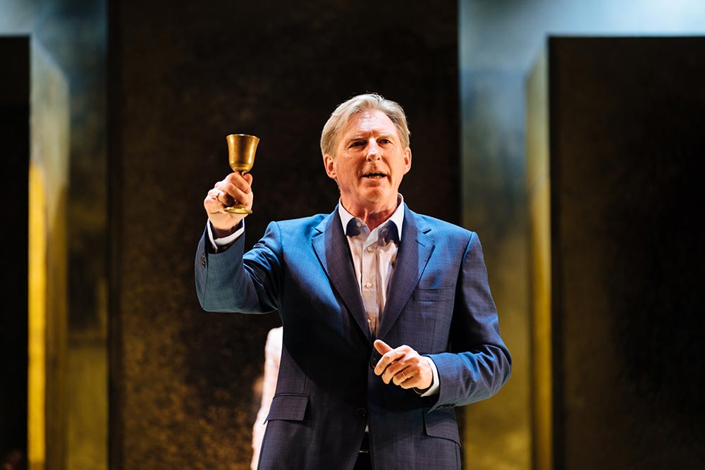 Yet most of all, what jars is the clash in style between the traditional Shakespearean delivery of Claudius, Polonius and Gertrude’s roles and the looser naturalism of the younger characters. Perhaps this was intentional, but the effect ends up grating. Adrian Dunbar’s approach to Claudius is initially promising, projecting a kingly authority with overtures of friendship and just a hint of menace. Yet as the play goes on, he lacks interiority, behaving in private almost identically to his public performances. Everything is pronounced rather than spoken, his words those of a patrician and patriarch. Such a choice makes sense when he addresses Hamlet, yet it makes his marriage to Gertrude seem entirely functional – perhaps a consolidation of power.