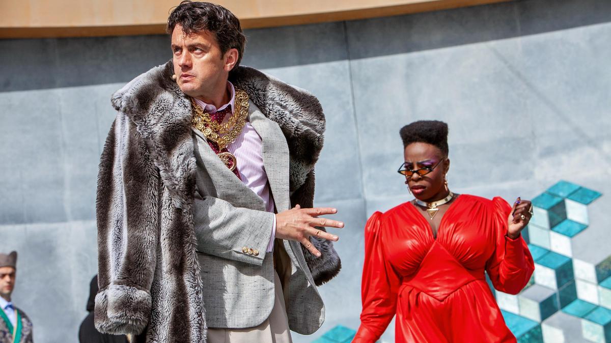 Otherwise, it is a terrifically considered and exquisitely detailed production. Breen ensures there’s never a dull moment and fills the stage with all kinds of business. Even the extras are given miniature narratives. A bored film crew, hired to document some kind of grand opening, come alive with gonzo journalistic excitement when violence erupts. In the second half, a man slowly walks back and forth upstage, carrying a comically increasing number of shopping bags from the RSC gift shop. At the heart of the production’s detail is the decision that almost everyone on stage should be angry with each other – apart from the Dromios, and Antipholus of Syracuse. The incidental characters become quietly incensed. A diner in a restaurant scene is visibly irate when his chair is purloined so that Antipholus and Dromio can sit down – peppering in extra laughs while also subtly increasing the play’s intensity. Later, one of the singers is rendered livid when Dromio steals her microphone. It is entirely in keeping with the original play that the main characters’ unwitting presences in Ephesus are an irritation, even causing material harm, to the people that live there.