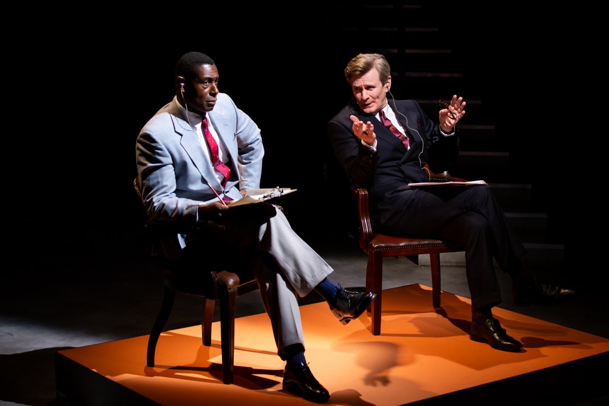 Generally, Graham’s writing falls into one (or both) of two standard shapes: dialectic, debate drama (This House, Coalition, Brexit, Labour of Love, Best of Enemies) and anti-hero narrative (Brexit again, in some ways Coalition, and Ink). Best of Enemies questions the latter category too, walking a careful line between making Buckley dramatically compelling, while not condoning his views (many of which would be generally considered outright bigotry today). Most of his charm on stage is down to David Harewood’s charisma, rather than making him outright sympathetic, but there is a curious and surely deliberate imbalance in the drama. Vidal is surrounded by a panoply of interesting figures, such as James Baldwin, Aretha Franklin and Andy Warhol – subjects of biopics of their own. (Warhol will be profiled in the Young Vic’s forthcoming show The Collaboration, which examines his work with Jean-Michel Basquiat). By contrast, Buckley has relatively anonymous acquaintances, like his wife Patricia, and his publisher. Graham almost completely resists the opportunity to let Buckley get the upper hand, partly due to the real history in which Vidal ‘won’ most of the debates according to viewers, but also to avoid letting Buckley’s unpleasant, even offensive arguments come across with any rhetoric of reasonableness. Harewood is compelling throughout, but it’s rare that he gets to make a proper point. In Act 2, he briefly gets the upper hand in one debate – but this is due to thrust and parry work, playing on Vidal’s own ego – rather than the strength of his own argument about the war in Vietnam.