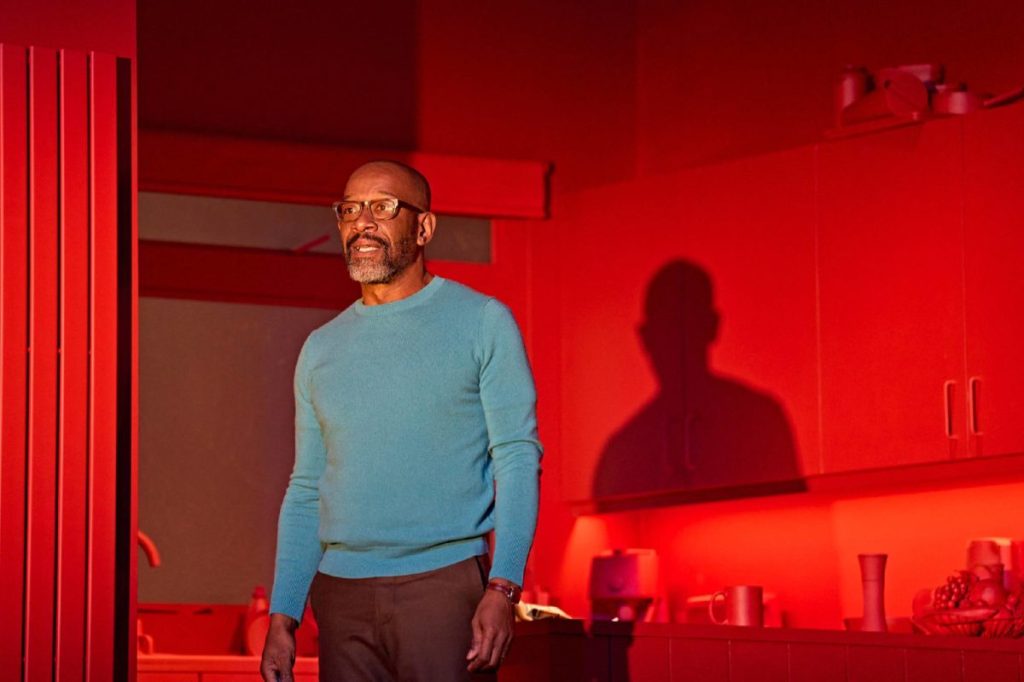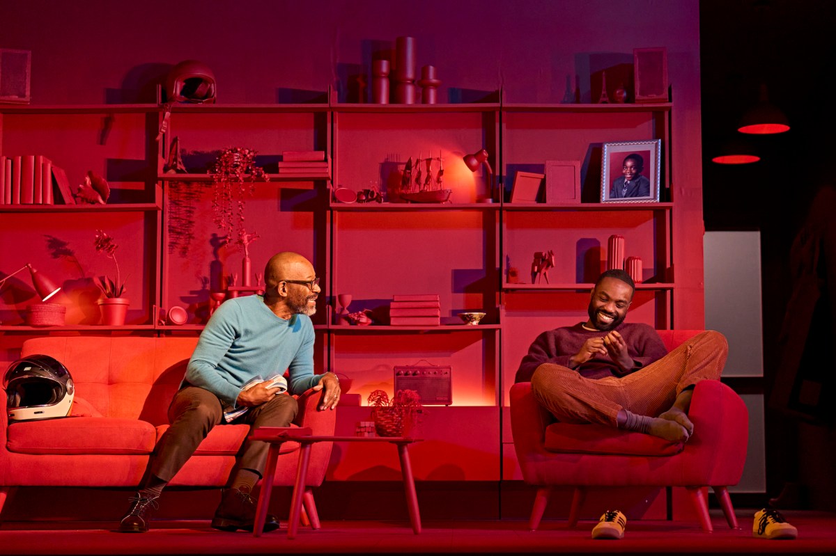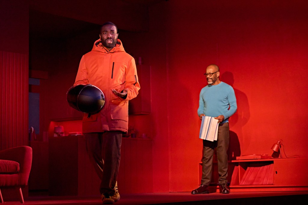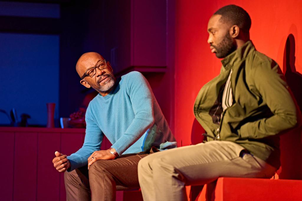 Lennie James, meanwhile, matches Essiedu – anchoring the play with an unshowy, subtle turn as Salter. His good-natured demeanour and stage action lull us into a security that is offset by the truth of his actions. Salter is often in motion – a proactive father – quietly undertaking housework tasks, and gently wringing tea towels with discomfort. When he talks about the difficulties of parenting, saying ‘I did cook meals now and then’, it seems less apologetic than self-effacing; he does seem – in some ways – an attentive, well-meaning dad, though with a secret eating him up inside. James opts to play him as a man who barely knows that he is lying, the effect brilliantly realised. Lies seem so customary to Salter that he cannot help it. ‘I’m not attempting to deny’, he says to Bernard 1, mere seconds after an attempted denial. James’ warmth makes Salter seem wretched rather than evil, not dissimilar to Allam’s take in 2020. It is probably the better choice, mining the role’s understated pathos rather than presenting him as a sinister, calculating manipulator. Salter does not consider himself a villain but becomes something like one through his efforts not to be.