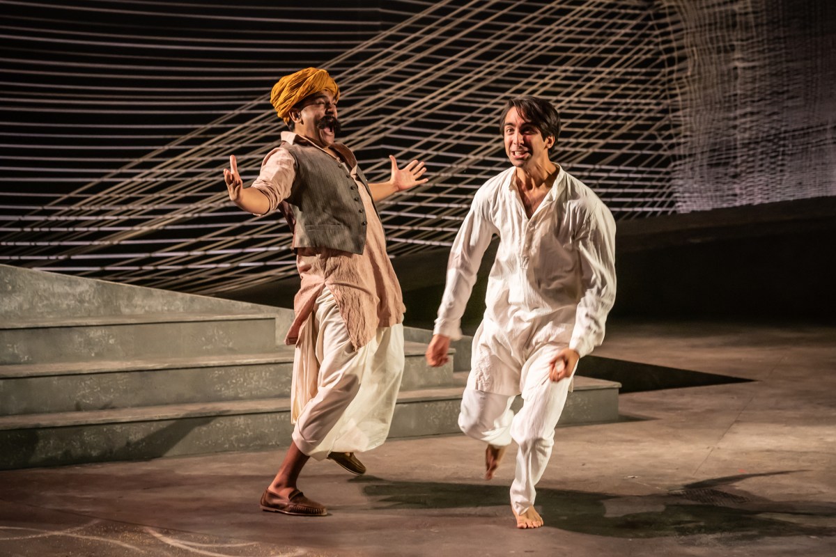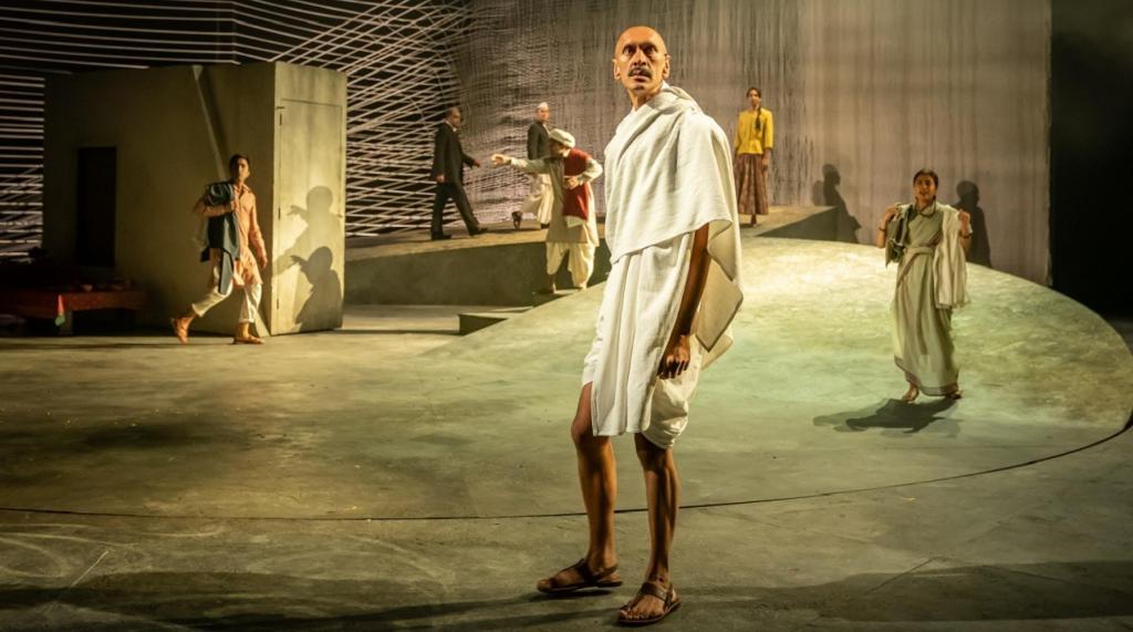 Chandrasekhar utilises the arena-like quality of the Olivier from the off, with Saraf’s opening monologue jokingly engaging the audience (to the point of exchanging brief, gig-like chat with some stalls-dwellers) and recruiting our complicity. He accosts us: ‘What are you staring at? Have you never seen a murderer up close before?’ Saraf plays Nathuram Godse, a man about whom ‘not much is known’ (by Chandrasekhar’s account in her ‘Note on the Play’), his nervy demeanour offset by a sometimes swaggeringly narcissistic confidence. His claim to notoriety is that, in 1948, he killed Mahatma Gandhi. The Father and the Assassin follows these two characters – Gandhi, popularly known as the father of the nation, and Godse, his killer – weaving their lives together into a complex exploration of radicalisation, colonial occupation, and the ethics of violence.