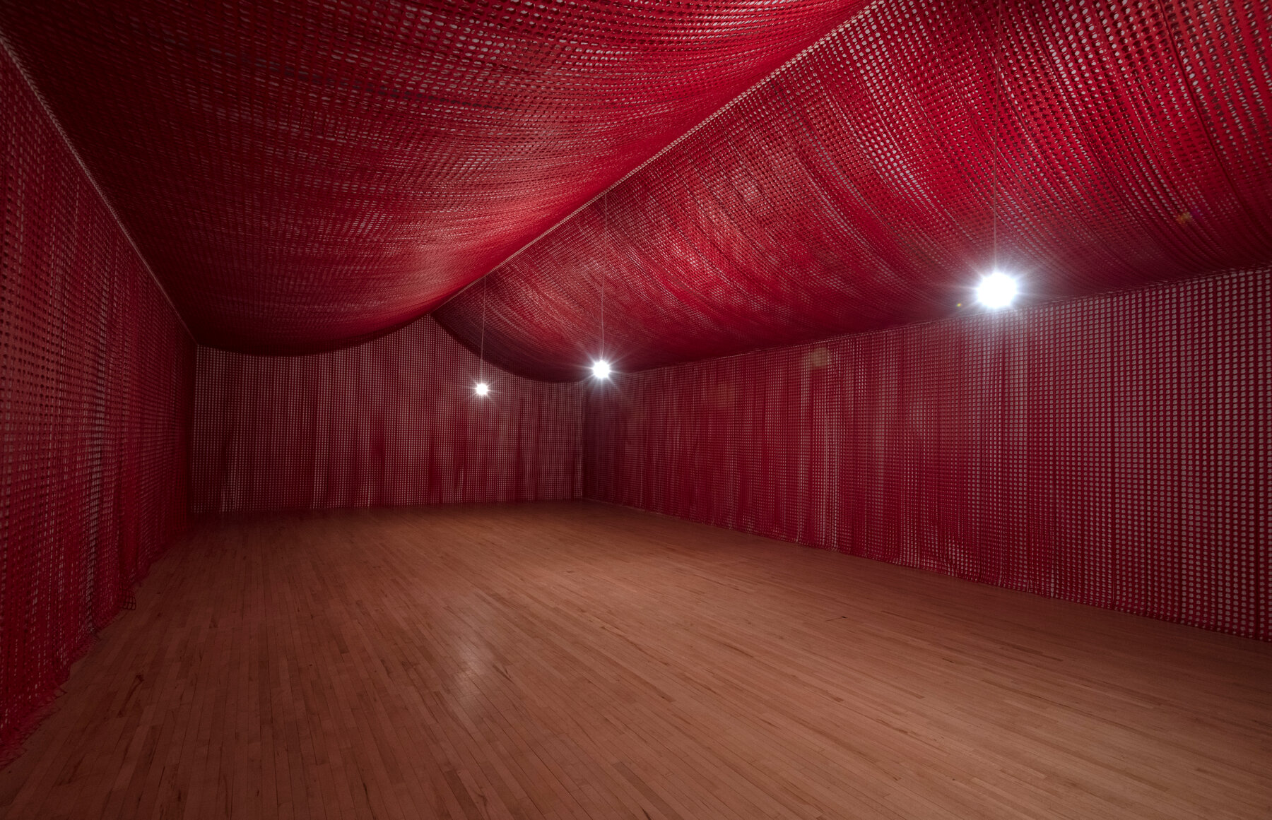 With the right material, Parker’s art can search deeper – though by remaining in a more abstract realm. War Room, first created in 2015, and recreated here, utilises one of the most striking offcuts in Parker’s repertoire: the paper shells of Remembrance Day poppies. She has affixed the long, machined sheets to the walls and towards the ceiling in the sloping shape of a large tent. Poppies occupy a fascinating space in contemporary political discussion. Their ubiquity in late October and early November is perhaps beginning to enter a decline, though they still remain one of the most widely recognised symbols in Britain. Frequent furores break out over whether television presenters are sporting poppies early enough, or whether the wearing is correct, while an annual debate unfolds over their ethics – and whether a white commemorative poppy, which celebrates and aspires towards peace, is more appropriate. Last year, campaigners called for the plastic in the poppies to be removed, making them recyclable and thus more sustainable. Yet, generally less widely known, is that some poppies are made by inmates of UK prisons, for which they are paid on average £10 per week. (Minimum wage in prison is a shockingly meagre £4 per week.)