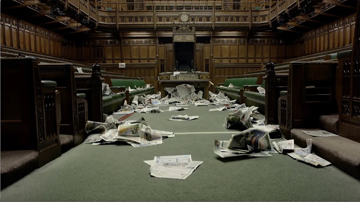 The descriptive text accompanying Island bears the closing line ‘With thanks to UK Parliament’ – the final words you read in the exhibition. The work deliberately evokes Brexit in its use of the White Cliffs of Dover as pigment – and in its title. (Parker has spoken about disliking ‘feeling not part of Europe’ and not wanting to be a ‘little Englander’.) Therefore, it seems hard not to attribute a wry irony, a trace of sarcasm to the thanks. Yet the statement is at least equally in earnest too. The tiles that cover the greenhouse’s floor were sourced from the Palace of Westminster – to which Parker has been afforded somewhat unprecedented access. She was the official Election Artist in 2017 – which came with the backing of the establishment, and an implicit duty to document journalistically, responding perhaps as a courtroom artist does – observing rather than commenting. Without access and assistance, Parker’s art would largely not exist. The results of these collaborations are frequently fascinating, though the spectre of compromise (inevitably) hovers over them.