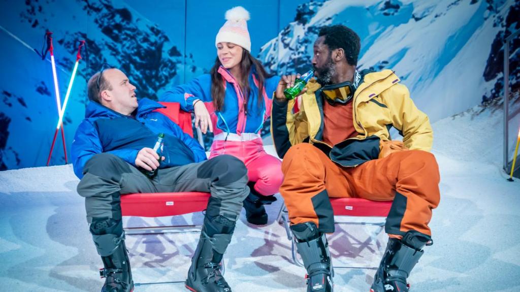 Natalie Abrahami’s production handles the play with energy and tenderness. Though some voices dominate more than others, no character remains elusive – the smaller roles all getting their moments. Particularly great are sequences in which the usually recalcitrant Tomaz (Charlie Reid) play-acts with Zoe (Taya Tower), the youngest juror. Never having experienced either plane travel and or snow, he creates the experience for them, in the gaps between the deliberations. Bubbles drift through the auditorium in the place of imaginary snowflakes.